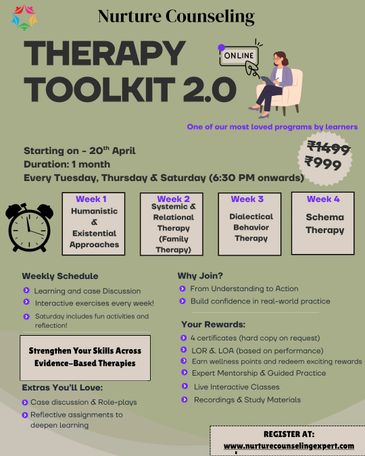 The Therapy Toolkit 2.0 by Nurture Counseling is a 1-month, skill-based training program designed to help psychology students and aspiring therapists bridge the gap between theory and real-world practice.
